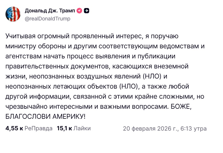 По словам президента, публикация этих данных даст человечеству возможность узнать правду о том, что происходит за пределами Земли. Он поручил ведомствам тщательно подготовить материалы, чтобы раскрытие информации было «структурированным, достоверным и максимально полным».