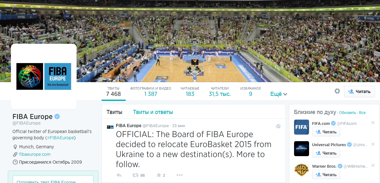 Международня федерация баскетбола (FIBA Europe) с помощью микроблога «Твиттер» сообщила о переносе Чемпионата мира по баскетболу из Украины, где он планировался, в другую страну.