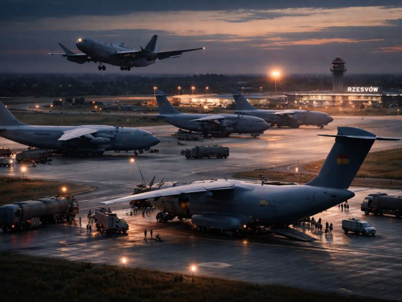 По данным канала «Военная хроника», в Жешув приземлились два военно-транспортных самолета Airbus A400M Atlas, принадлежащие ВВС Бельгии, а также служебный самолет Gulfstream G550 польских ВВС. Кроме того, аэродром принял два канадских Lockheed CC-130J Hercules и тяжелый транспортный Boeing C-17A Globemaster III Королевских ВВС Великобритании.