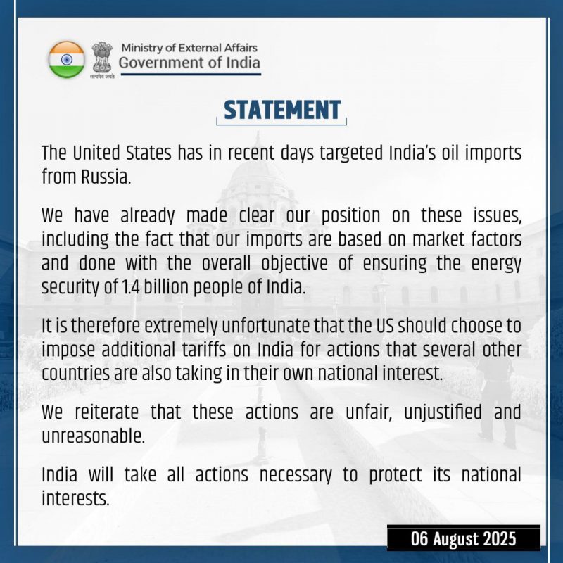 Поводом для заявления стало подписание президентом США Дональдом Трампом указа о введении 25-процентных тарифов на индийский импорт. В документе прямо указывается, что эти меры связаны с продолжающимися поставками нефти из России, которые осуществляются Индией как напрямую, так и через посредников. Нью-Дели рассматривает данный шаг как попытку внешнего давления на свою независимую энергетическую политику.