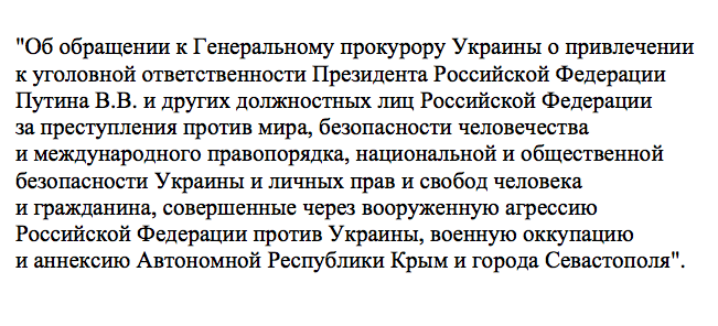 Сайт Верховной Рады Украины опубликовал проект постановления, по которому российского президента Владимира Путина могут подвергнуть уголовному преследованию, передают РИА Новости.