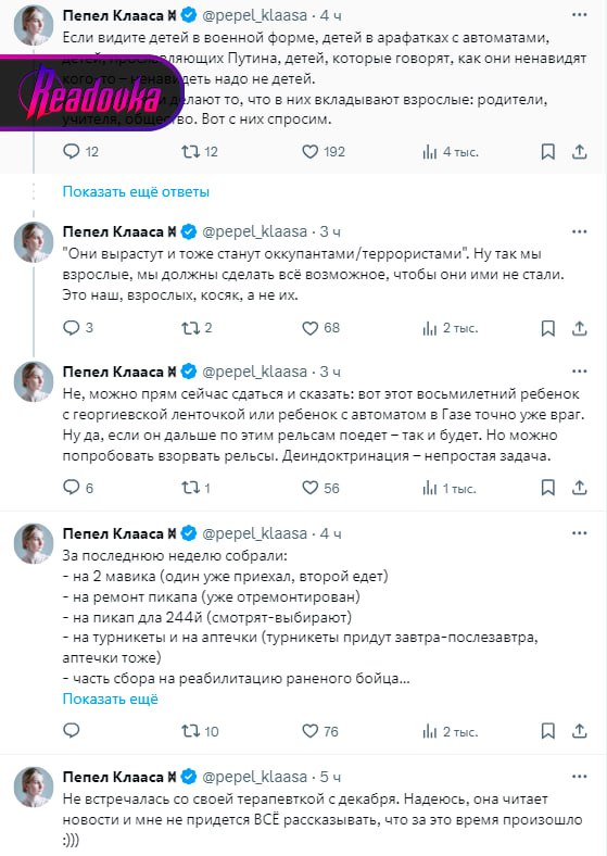 Помимо бесчеловечных речей на тему воспитания русских детей, она отчиталась о своих донатах ВСУшникам. Женщина, живущая в Бельгии, активно спонсирует кровопролитие на Украине и хвастается им в соцсетях. В последнем отчёте она сообщила, что вместе с подписчиками ей удалось собрать на два дрона и покупку машины для украинских солдат. Перед этим она призналась, что с декабря перестала посещать терапевта. Очевидно, что пора на приём. А вот Следкому пора проверить девушку на предмет оскорбления памяти защитников Отечества.