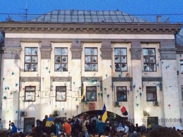 Однако ближе к вечеру, плакатов и лозунгов показалось мало, к посольству подтянулись другие, заскучавшие от безделья обитатели Майдана. Появились какие-то подростки с пейнтбольными автоматами, которые начали обстреливать окна посольства. Вслед за подростками уже половозрелые юноши начали метать в здание посольства яйца и пузырьки с зеленкой. Все это с большим удовольствием транслировали все основные украинские телеканалы, которые все как по команде елейными голосами рапортовали: «простые киевляне, пришли к посольству России выразить свое возмущение…».