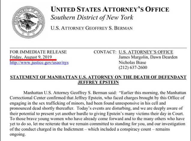 Документ датирован 9 августа 2019 года, хотя официальные отчёты исправительного учреждения утверждали, что тело Эпштейна нашли лишь утром 10 августа. Прокурор Манхэттена Джеффри Берман тогда назвал произошедшее «тревожным событием».