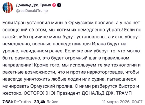 На этом фоне Дональд Трамп выступил с довольно истеричными угрозами в своей соцсети Truth. Он потребовал немедленно убрать мины из Ормузского пролива. Демонстрируя ярость, президент США пообещал уничтожать любые лодки, включая, к примеру, рыбацкие – ведь кто угодно может сбросить в воду пару мин.