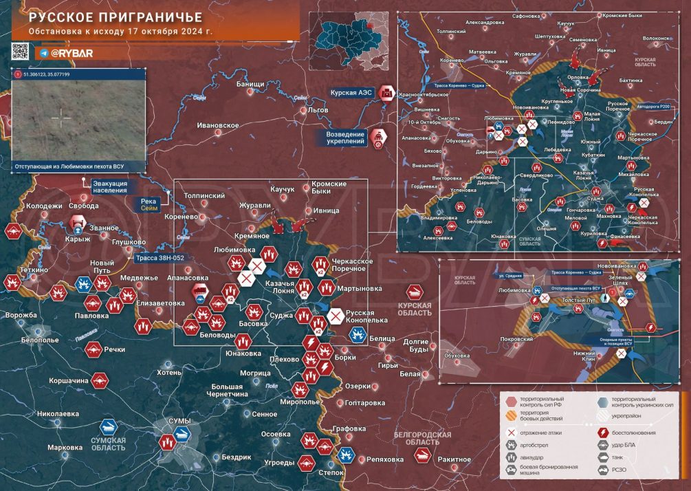 Основные районы боевых действий остаются в квадрате Любимовка-Леонидово-Свердликово-Дарьино. Стратегически важно лишить противника логистики на севере Суджи и установить более плотный огневой контроль над снабжением ВСУ из Сумской области. Для этого российским войскам необходимо продвигаться к линии Свердликово-Лебедевка.