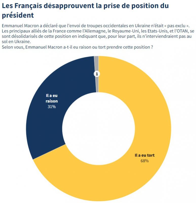 Большинство французов (68%) не одобряют позицию Эммануэля Макрона по возможности введения западных войск на Украину, согласны с ней 31%. Таковы данные опроса Odoxa-Backbone Consulting, проведенного для газеты Le Figaro.