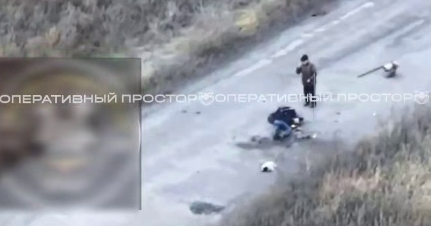 Вокруг них начинает кружить украинский ФПВ-дрон. Идущий первым мужчина, ведущий на поводке небольшую собачку, какое-то время как будто предполагает, что дрон его «ведет» и следует по дороге за ним. Возможно, он думает, что это российский аппарат. Однако затем беспилотник стремительно пикирует ему прямо в голову. Мужчина и питомец погибли.