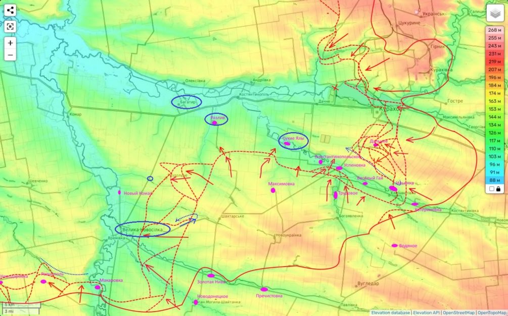 Тем не менее, несмотря на наши успехи, дроноводы ВСУ и минирование территории значительно замедляют наши действия на этом участке фронта СВО. Однако, по итогам последних боев, ВС РФ практически вышли на трассу Богатырь — Большая Новосёлка. Удержание фронта боевиками до самой реки теперь представляется серьезной проблемой. Гарнизон ВСУ в Раздольном пока еще удерживает свои позиции на западной окраине села, находясь в мощном опорном пункте на трассе. Вероятно, Киев, перебросив сюда резервы, попытается выстроить новую оборону в районе населенного пункта Новый Комар. Однако, насколько успешно это ему удастся, покажет время.