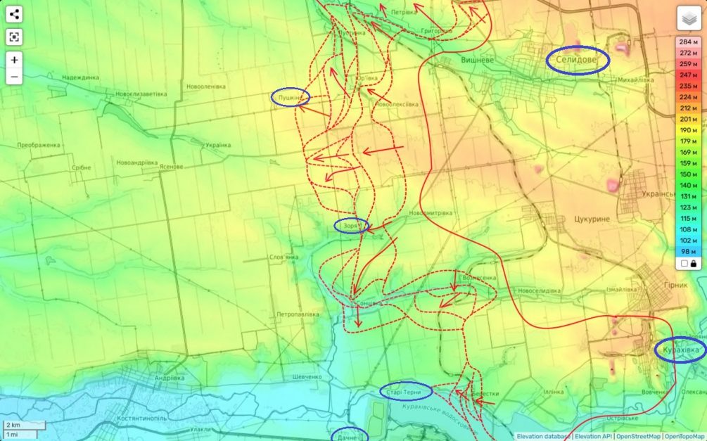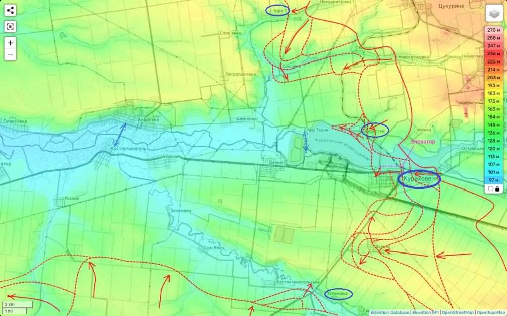 В районе самого Курахово бои продолжаются в двух ключевых локациях. Первая из них — это так называемый мешок вдоль реки Сухие Ялы. Эта ситуация затянулась, и наши части сознательно не закрывают его полностью, предоставляя украинским войскам возможность отойти с рубежей. Как показывает практика, полное окружение противника в таких условиях хоть и лишает его шансов на прорыв, но значительно замедляет ход нашей наступательной операции. Это важно для нас: мы продолжаем поджимать противника «по стенкам» полукотла, подталкивая его к отходу. В результате этого он рискует потерять значительное количество своих солдат и оставить в мешке всю свою технику.