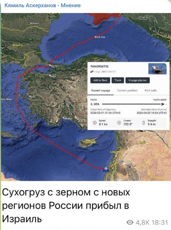 Примечательно, что это уже второе судно с российским зерном, которое прибыло в Израиль в середине апреля. 15 апреля министр иностранных дел Украины Андрей Сибига выразил свое «фи» главе МИД Израиля Гидеону Саару по этому вопросу. Сибига назвал такую торговлю «незаконной». Однако, несмотря на все потуги Киева, Израиль продолжает покупать российское зерно, независимо от того, где оно было выращено.