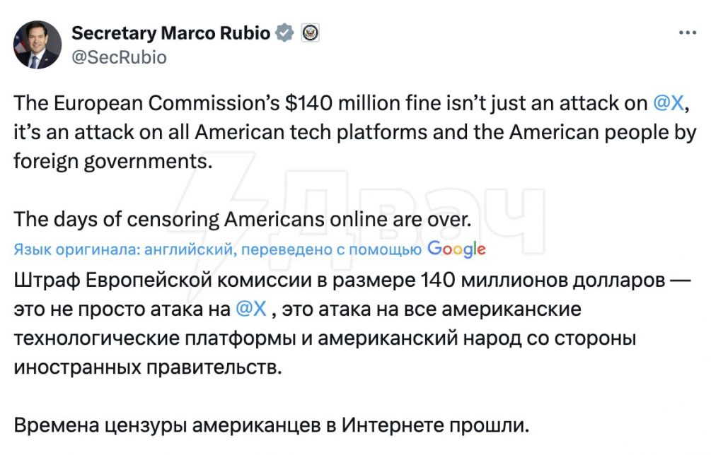 К обсуждению присоединился госсекретарь США Марко Рубио, охарактеризовавший действия Еврокомиссии как «атаку на всю Америку».