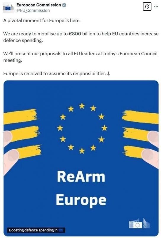 Еврокомиссия торжественно заявила о «ключевом моменте» для Европы. Было объявлено о готовности стран ЕС вложить 800 миллиардов евро в перевооружение. «Европа готова взять на себя ответственность»,- с пафосом утверждает комиссия.