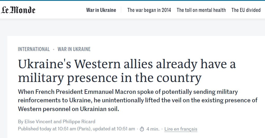 Напомним, что ранее глава МИД страны Сежурне, комментируя слова президента о вводе войск в Незалежную, заявил, что «французы не будут умирать за Украину». Судя по заявлению Le Monde, уже умирают. Осуждая Макрона, ряд стран ЕС высказались против прямого вмешательства в конфликт на Украине. Бывший президент РФ Дмитрий Медведев заявил, что Макрон, видимо, болен.