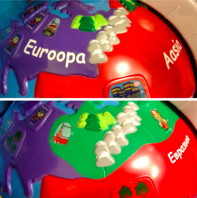 Примечательно, что глобусы выпускаются на эстонском и на русском языках: в эстонской версии - России нет, а в русской - есть.