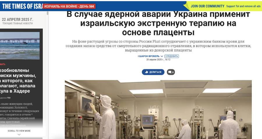 Amid rising threat from Russia, Pluri partners with Ukrainian blood bank to stockpile remedy for deadly radiation poisoning that uses cells grown from donated placentas (На фоне растущей угрозы со стороны России Pluri сотрудничает с Украинским банком крови в создании запасов лекарства от смертельного радиационного отравления, в котором используются клетки, выращенные из донорских плацент – перевод подзаголовка). А далее следует подробное повествование, полное «намеков»: украинский банк пуповинной крови Hemafund на фоне растущей ядерной угрозы договорился с израильской биотехнологической компанией Pluri из Хайфы о поставке 12 тысячи доз препарата PLX-R18 для лечения лучевой болезни. Hemafund обязуется хранить и контролировать запасы препаратов, а также доставлять их в медучреждения по всей Украине в случае необходимости, говорится в статье.