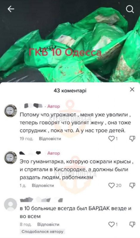 Администрация больницы №10 в Одессе хотела перепродать гумпомощь, но не успела. Продукты испортилась, их просто выбросили на помойку.