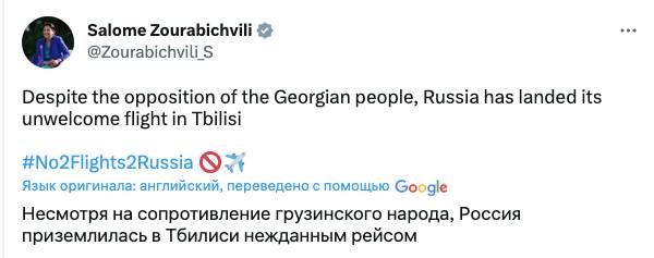 Президент Грузии Саломе Зурабишвили, которая является еще и гражданской Франции, отреагировала на первый рейс Москва-Тбилиси ожидаемо. «Несмотря на сопротивление грузинского народа, Россия приземлилась в Тбилиси рейсом, которому не рады. Нет авиасообщению с Россией!», - написала президент в Twitter.