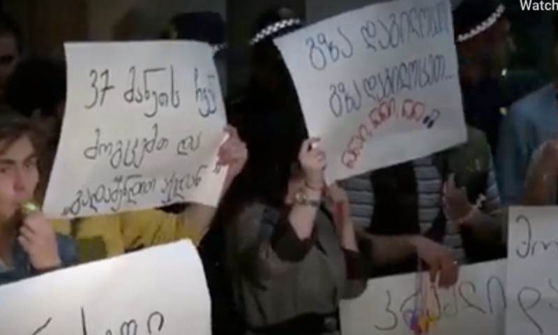 Пока одни прорывались в здание аэропорта, находящиеся снаружи сотоварищи скакали, свистели в принесенные свистки и скандировали кричалки другие «Русский воздушный корабль - иди ……». В руках митингующие держали плакаты и флаги Грузии и ЕС, давая понять, что грузинский народ с Евросоюзом, а не Россией.