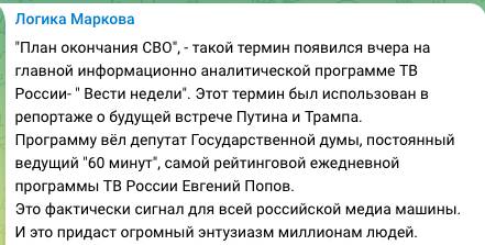 Примечательно, что и в России заговорили об окончании специальной военной операции. Политолог Сергей Марков обратил внимание на то, что в главной информационно-аналитической программе «Вести недели» «запустили» термин «План окончания СВО» в контексте будущей встречи Путина и Трампа. В своем телеграм-канале Марков подчеркнул, что постоянным ведущим программы на телеканале «Россия» является депутат Госдумы Евгений Попов.