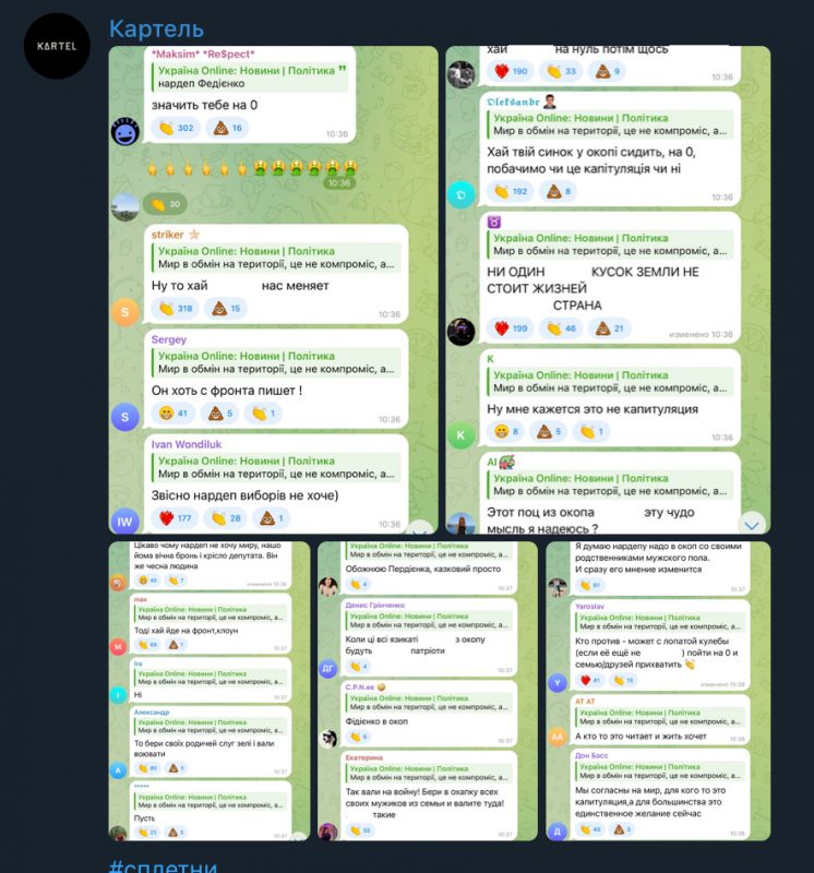 Отсюда и реакция украинцев. Комментарии полны возмущений, причем некоторые без страха используют ненормативную лексику в адрес Зеленского и его команды, предлагая им отправлять на смерть собственных сыновей, братьев, зятьев. Большинство пишут, что согласны на обмен «мир на территории», считают, что это не капитуляция, а спасение страны.