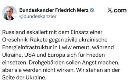 Не остался в стороне и канцлер ФРГ Фридрих Мерц, который тоже написал, что Россия добивается эскалации, применив «Орешник» против «гражданской украинской энергетической инфраструктуры во Львове, в то время как Украина, США и Европа работают над установлением мира. Эти угрозы призваны вселить страх, но они не сработают». Надо было сделать акцент на то, что именно Россия срывает переговоры, потому что у нее далеко идущие «воинственные планы».
