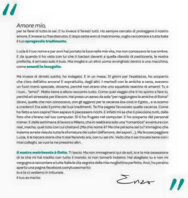 - Моя любимая, ты знаешь, что я готов сделать всё для тебя. Я всегда пытался защитить нашу любовь, но всё разрушила ты. После семи лет брака я хочу рассказать всей Италии о твоем презренном предательстве, - так начал статью итальянец.