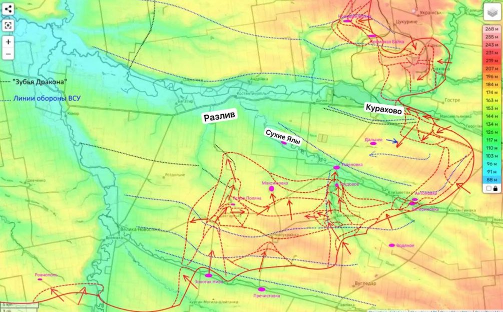 На юге от этого города наши подразделения двигаются сразу в нескольких местах. Во-первых, осталась пара километров до населенного пункта Разлив. Во-вторых, до Сухих Ялов и то меньше, каких-то километр-полтора.