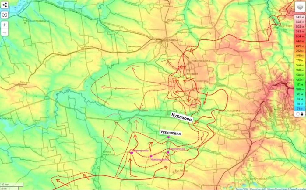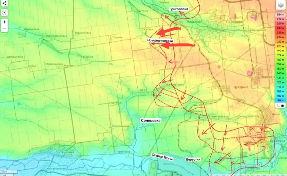 На севере от Курахово пол нашим контролем Ильинка, взята большая часть Берестков. Здесь на очереди Солнцева и Старые Терны. Тем временем, ведутся наступательные действия и от освобожденного Селидово, в сторону Покровска мы зашли в Григоровку, развиваем успех в Новоалексеевки. По мнению Подоляки, выполнение задач на любом из перечисленных участков вполне логично перетечет на движение в сторону границы с Днепропетровской областью.