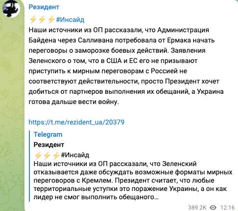 То, что в США активно обсуждают тему мира, говорят соответствующие статьи в западных СМИ, где выступают политики, политологи, эксперты и аналитики. Хорошо осведомлены об этом и в самой Украине. Так украинский телеграм-канал «Резидент», имеющий надежные источники в офисе президента Владимира Зеленского сообщил, что администрация Байдена давит на главу офиса Зеленского Андрея Ермака с тем, чтобы украинский президент начал переговоры с Россией ради заморозки конфликта.