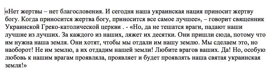 Духовенство украинской греко-католической церкви делает такие замечаения не в первый раз. В феврале 2014-го, когда в Киеве развернулся протестный Майдан, подобные заявления звучали от другого католика - Михаила Арсенича. Тогда он обратился к украинцам с призывом взять в руки оружие и уничтожить всех коммунистов, москалей и евреев.