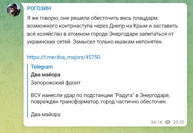 «Я же говорю, они решили обесточить весь плацдарм возможного контрнаступа через Днепр на Крым и заставить всё хозяйство в атомном городе Энергодаре запитаться от украинских сетей. Замысел только ишакам непонятен», - написал он.