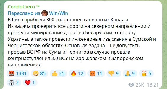 В российских военных Телеграм-каналах в последнее время часто заявляют о подготовке ВСУ нового наступления на фронте СВО, в частности в Харьковской области и в Запорожье. Авторы Telegram-канала Condottiero заявляют, что армия Украины готова бросить в бой 100 тысяч бойцов.