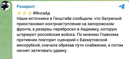 О том, что контрнастпуление «сворачивают», перебрасывая все резервы в Авдеевку, сообщил украинский инсайдерский телеграм-канал «Резидент», имеющий надежные источники в офисе президента Владимира Зеленского. Как пояснил источник, Залужный убежден, что российские военные намерены обрезать все пути снабжения украинских боевиков, а затем затянуть смертельную петлю. Когда генерал обрисовал ситуацию Зеленскому, тот заявил, что Украина не переживет «второго Бахмута» теперь уже в Авдеевке. Потеря стратегического города может поставить крест на требования Украины, подчеркивает «Резидент». Отсюда и решение приостановить контрнаступление в Запорожье.