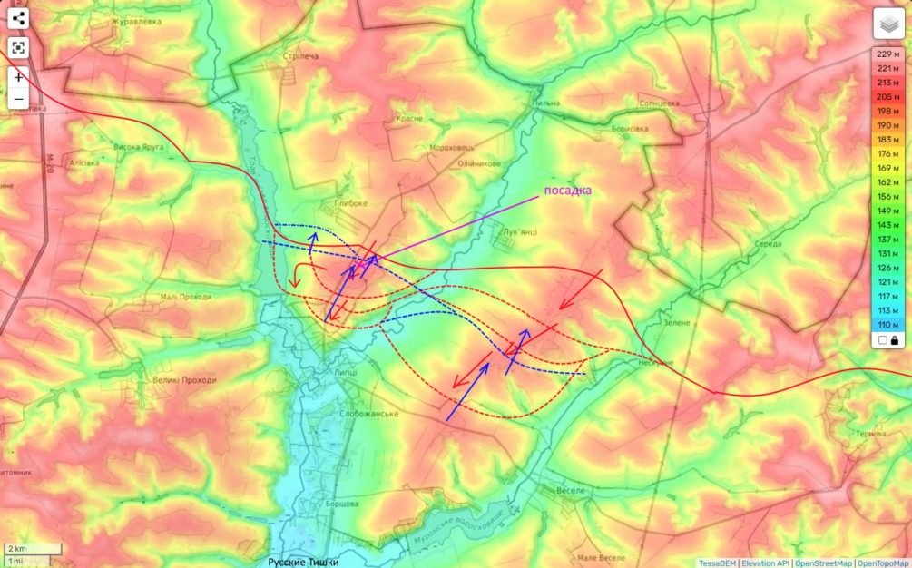 «В районе западнее н.п. Зеленое штурмовые подразделения развивают вчерашний успех и продвигаются дальше в направлении н.п. Липцы, вытесняя ВСУ. Общее продвижение российских войск составило до 1000 метров», - отмечают в ГВ «Север».