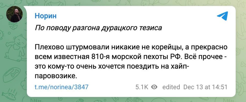 Тема табуирована, пишут «Два майора», поэтому официальной информации нет и приходится основываться на обрывистых данных военкоров. Российский военный публицист Евгений Норин опроверг информацию о том, что северокорейские войска вступили в бой с ВСУ в Курской области. Он заявил: «Плехово штурмовали никакие не корейцы, а прекрасно всем известная 810-я морская пехота РФ. Всё прочее - это кому-то очень хочется поездить на хайп-паровозике».
