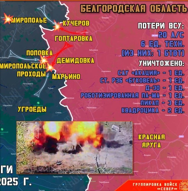 Группировка войск «Север» отразили все атаки, не допустив пересечения государственной границы. Живая сила противника была уничтожена. В районе Гоптаровки российские бойцы с помощью дронов ликвидировали штурмовую группу, состоящую из бывших заключенных 225 отдельного штурмового полка ВСУ.