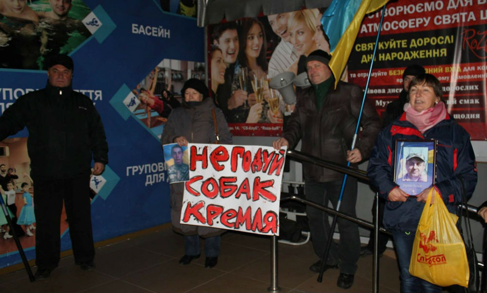 Вечером под зданием клуба собрались представители радикальных организаций – «Правого сектора» (запрещенного в РФ), «Свободы» и «Азова». Они устроили буйную акцию протеста – разбивали банки с кровью животных, бросали яйца, петарды и взрывали дымовые шашки. Националисты держали плакаты: «Не корми собак Кремля», «Вон из Украины холуев Путина!». Многие из них скрывали лица под масками и опущенными капюшонами.