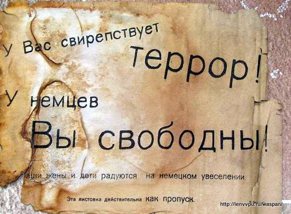 В листовках, которые разбросали сегодня над Славянском (рис.1), содержится «инструкция мирному населению по выживанию на территориях, где действуют российские террористы». А вот (см.рис.2, 3) – образец творчества предшественников новых киевских властей – фашистских захватчиков. Как говорится, найдите десять отличий.