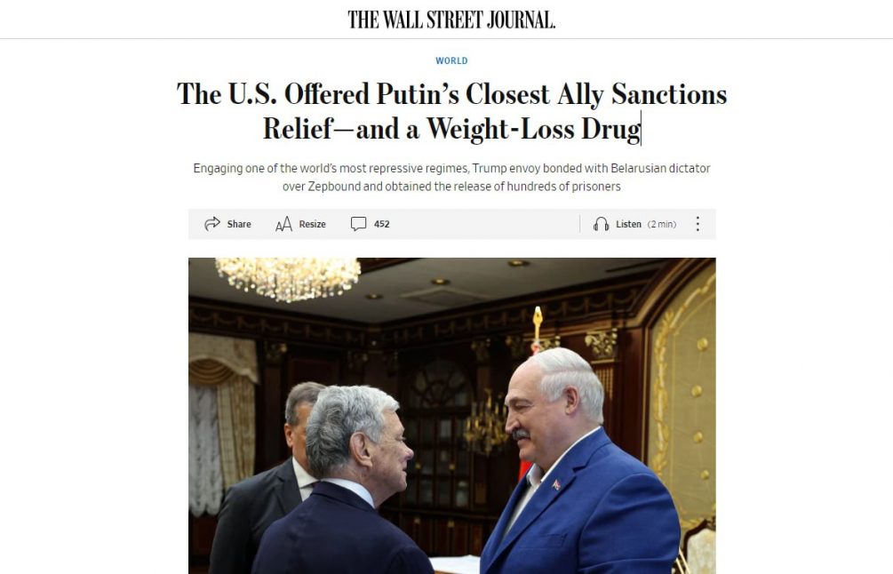 The Wall Street Journal пишет, что Вашингтон наладил неофициальный канал общения с Александром Лукашенко. В рамках этого диалога США уже частично смягчили санкции против белорусских производителей калийных удобрений, договорились с Boeing о поддержке авиакомпании «Белавия» и пошли на другие шаги. Главная цель - показать через Лукашенко пример Путину: мол, так же будет и с Россией, если согласитесь на мир.