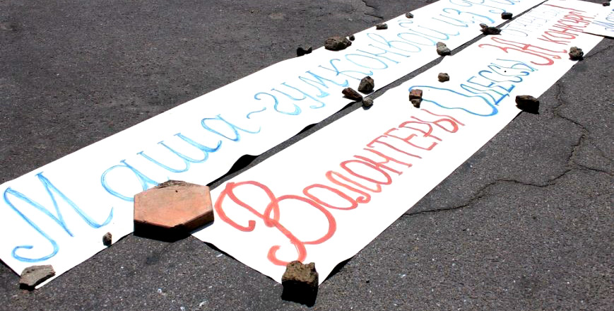 Протестующие держат плакаты «Маша не наша!», «Оно нам надо?!», «Михо! Это твоя ошибка!», «Маша - гумконвой из Раши». Пикетчики разложили на асфальте плакат с надписью «Волонтеры Одессы - за открытый конкурс!».