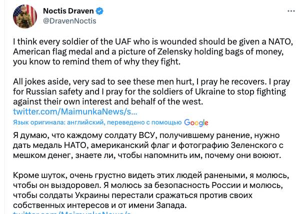 Ноктис Дрейвен считает, что каждый раненый в боях украинец должен четко понимать, за что отдает свою жизнь.