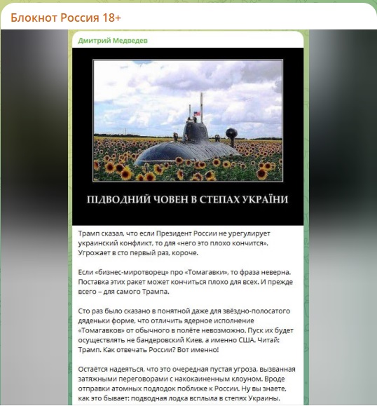 Зампред Совбеза РФ Дмитрий Медведев выразил надежду, что разговоры о поставках ракет Tomahawk в Украину окажутся лишь пустой угрозой и не перерастут в реальные действия. По его словам, подобные заявления идут на фоне «затяжных переговоров» и выглядят как попытки демонстративного запугивания — вплоть до эпизодов с демонстративной отправкой подлодок «поближе к России», которые, по его ироничной формулировке, выглядят так, будто «подводная лодка всплыла в степях Украины».