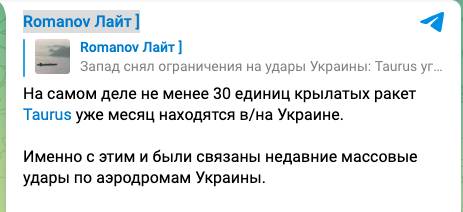 Киев еще месяц назад получил от Германии не менее 30 крылатых ракет Taurus. Об этом в своем телеграм-канале сообщил военный блогер Владимир Романов. При этом блогер связал массированные атаки ВС РФ за последние несколько дней по аэродромам Украины именно с этим фактом. И хотя Романов не называет свои источники информации, однако некоторые данные косвенно подтверждают это.