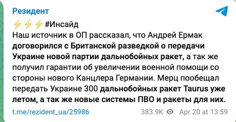 В частности, украинский телеграм-канал «Резидент» со ссылкой на надежный источник в офисе президента Украины еще в конце апреля писал о неких договоренностях между главой офиса Андреем Ермаком и британской разведкой. Договорились о передаче Украине новой партии дальнобойных ракет. Также Ермак получил гарантии, что военная помощь Германии будет увеличена, и канцлер Фридрих Мерц передаст уже летом Украине 300 дальнобойных ракет Taurus. Сошлись и на том, что Берлин обеспечит Украину новыми системами ПВО и ракетами для них. Издание указывает, что именно для такой задачи глобалисты и тащили в канцлеры Фридриха Мерца.