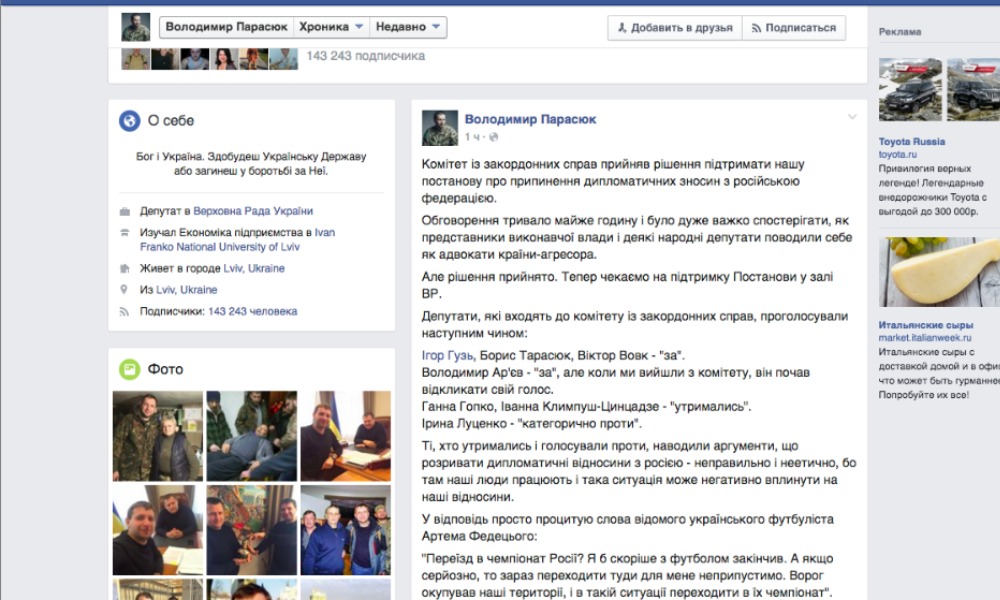- Комитет по иностранным делам принял решение поддержать наше постановление о прекращении дипломатических отношений с Российской Федерацией, - написал Парасюк на своей странице в социальной сети Facebook. - Обсуждение продолжалось почти час… Но решение принято. Теперь ждем поддержку постановления в зале ВР (Верховной рады, - прим. ред.).
