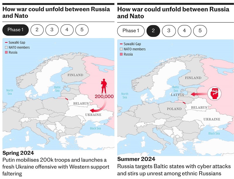 По версии СМИ, гипотетическая Третья мировая война может развиваться так. Весной РФ идёт в наступление на Украине, параллельно мобилизуя 200 тысяч солдат. За лето армия России громит Киев и осенью в Прибалтике вспыхивают протесты русскоязычных жителей против репрессий местных властей. Наряду с этим против Эстонии, Литвы и Латвии проводится ряд кибератак.