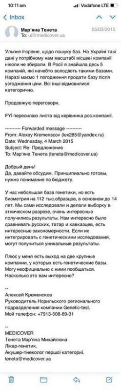 Во взломанной переписке Яринич оказались не только доказательства взяток мэру Львова Андрею Садовому и экс-министру здравоохранения Украины Раисе Богатыревой, но и несколько писем, касающихся генетического исследования.