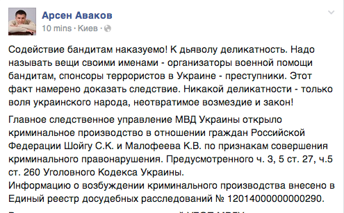 Как пишет Аваков на своей странице в Фейсбуке, если Шойгу и Малофеев не явятся на следственные мероприятия, то их арестуют.