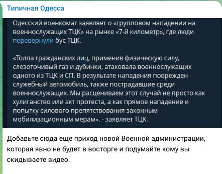 «Людоловов Зеленского поймали и допросили, машину перевернули и разбили. Пожалуй, такой организованный отпор мог бы стать повсеместным. Глядишь, и война бы скорее окончилась. Чем больше жителей Украины будет поступать также, как мужики с одесского рынка, тем быстрее падет военная диктатура Зеленского, тем быстрее настанет мир», «Так их, чтобы в следующий раз не смели соваться», «В Одессе на рынке перевернули автобус ТЦК. Скоро начнут отстреливать. Одесса не побеждается за пару лет непонятными клоунами из Кривого Рога», - комментировали люди.
